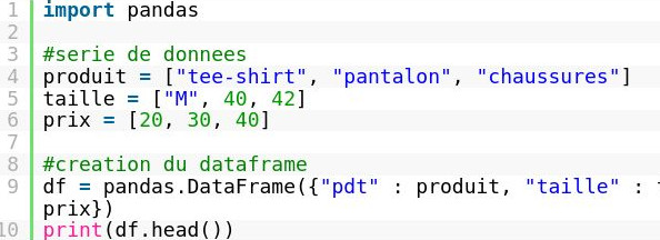 df = pandas.DataFrame({"pdt" : produit, "taille" : taille, "prix" : prix})