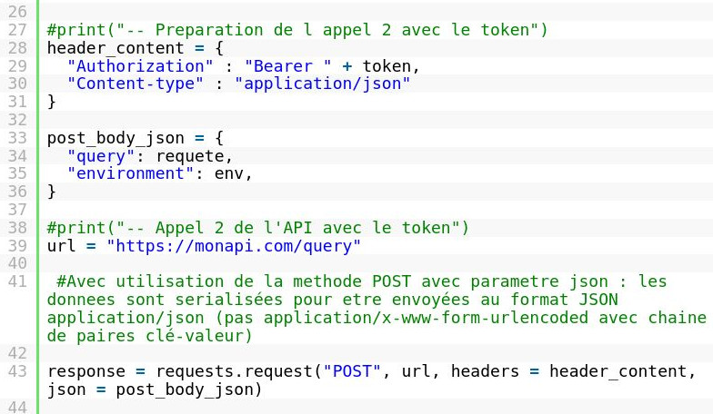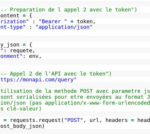 Ensuite, il s’agit de préciser les différents composants d’une requête (header, payload, authentification), puis de rassembler tous ces elements pour envoyer la requete avec urllib.